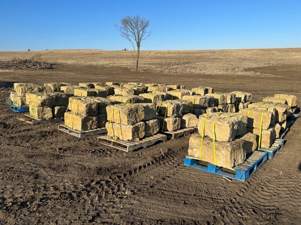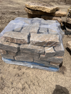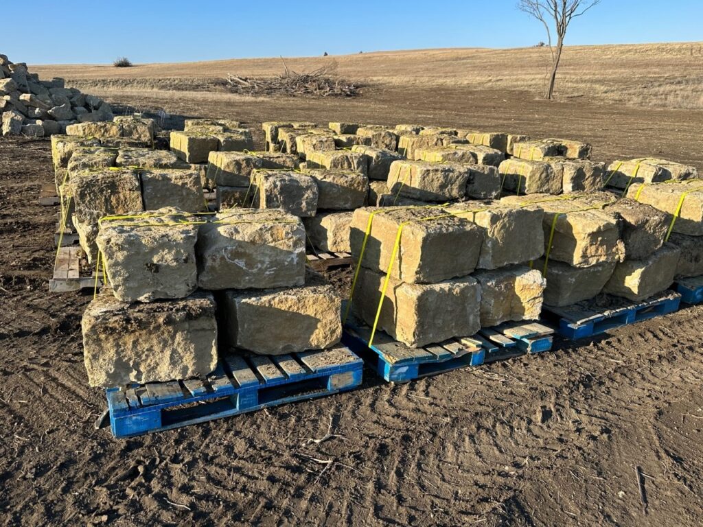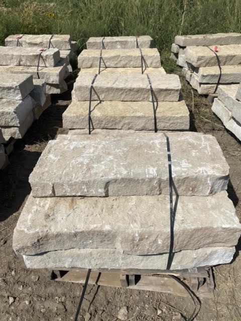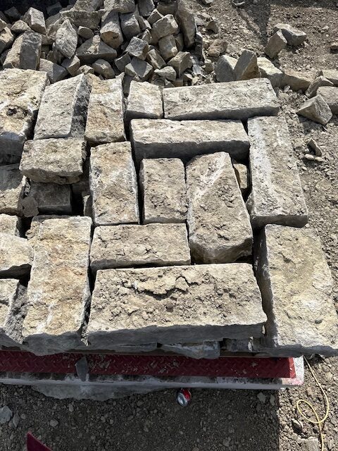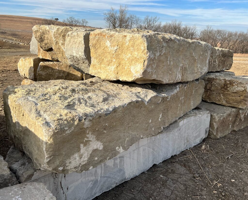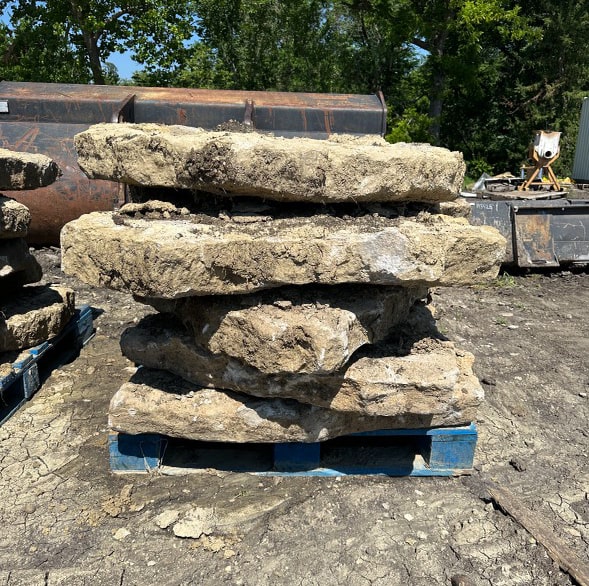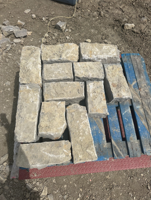 Palletized 14″ limestone cubes that measure at 14″ tall, 2 to 3′ long, and 18-24″ wide. Roughly 250-600lbs per piece.