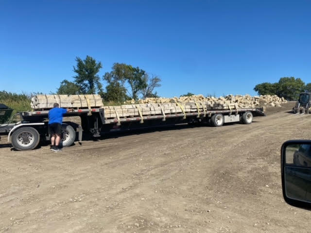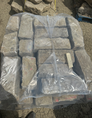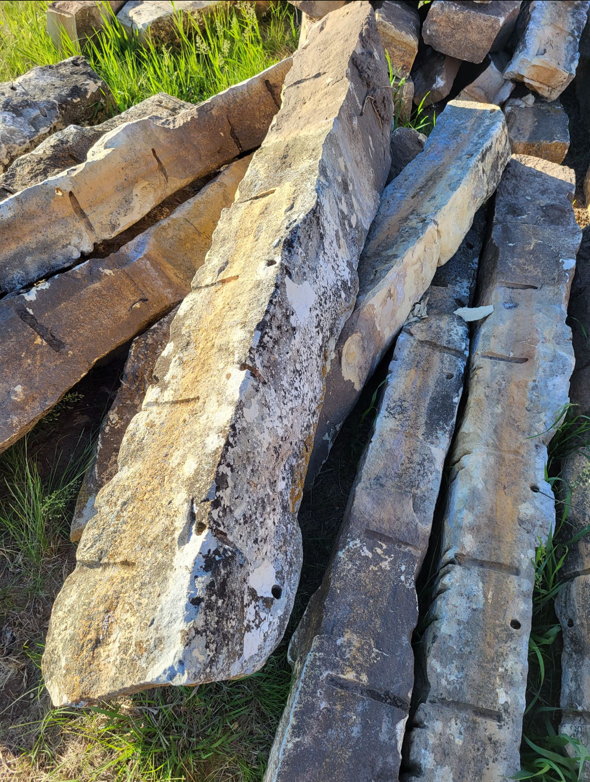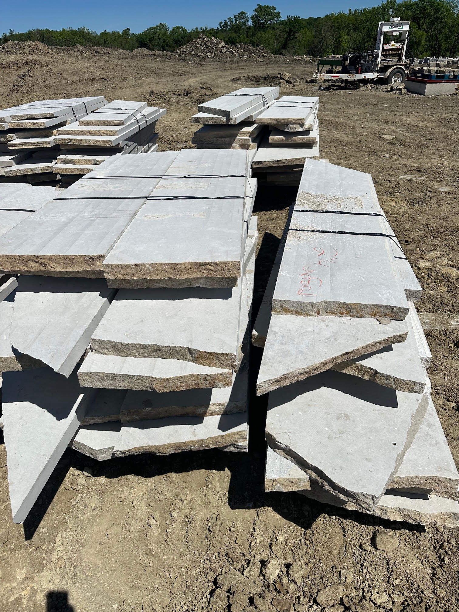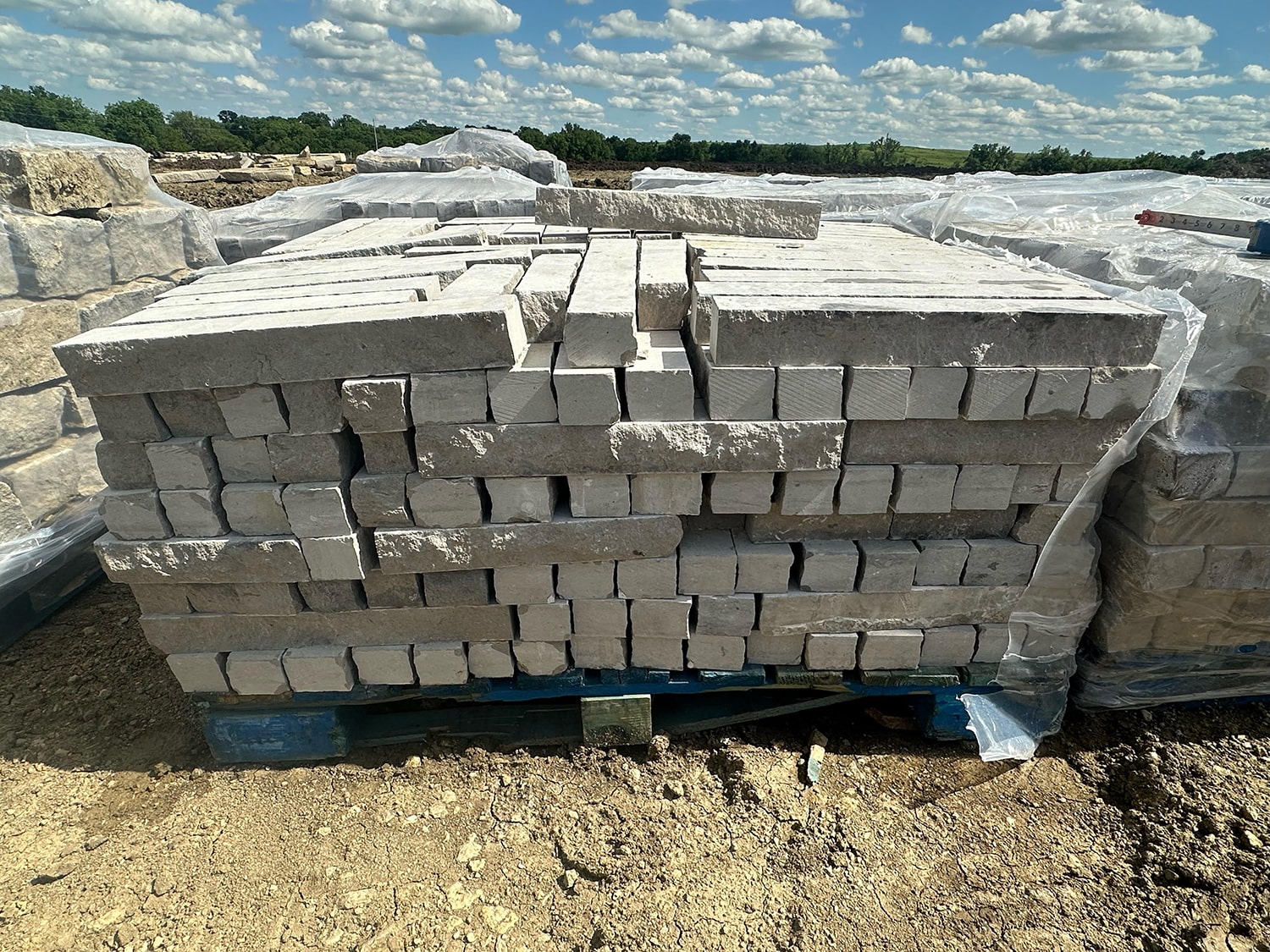 Palletized 14″ limestone cubes that measure at 14″ tall, 2 to 3′ long, and 18-24″ wide. Roughly 250-600lbs per piece.